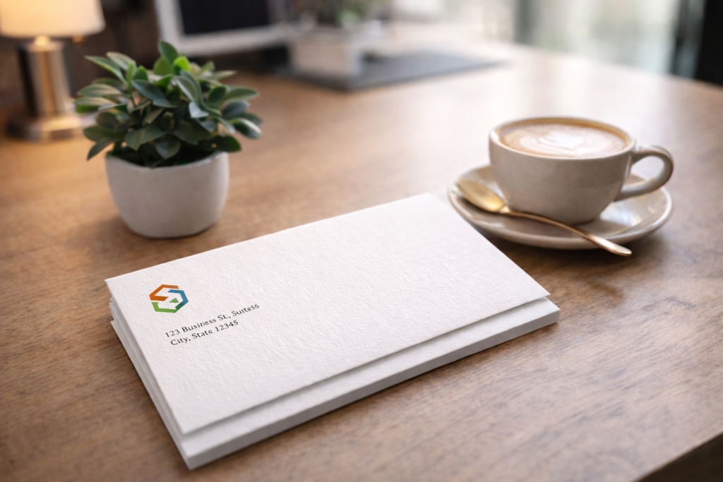 W praktyce koperta z nadrukiem nie jest tylko nośnikiem logo. To jeden z elementów, które razem budują obraz firmy jako uporządkowanej, wiarygodnej i profesjonalnej.
